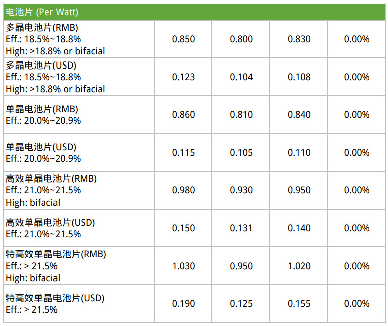国内一般多晶电池片维持不变在0.80~0.84RMB/W,高效多晶电池片维持不变在0.85RMB/W,一般单晶电池片维持不变在0.81~0.86RMB/W,高效单晶电池片维持不变在0.93~0.97RMB/W,特高效单晶(>21.5%)电池片修正区间至0.95~1.02RMB/W,均价维持不变在1.02RMB/W。双面高效单晶电池片维持不变在0.98RMB/W,双面特高效单晶(>21.5%)电池片修正区间至1.03RMB/W。