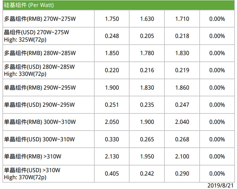 国内270W~275W产品维持不变在1.63~1.75RMB/W,280W~285W产品维持不变在1.78~1.85RMB/W,290W~295W产品维持不变在1.83~1.90RMB/W,300W~305W产品维持不变在1.90~2.05RMB/W,>310W产品维持不变在1.95~2.13RMB/W。