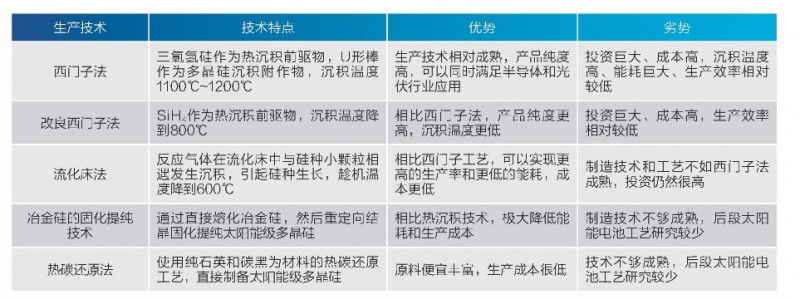 多晶硅主要采用化学提纯、物理提纯两种方法进行生产,其中化学提纯方法主要有西门子法(气相沉淀反应法)、硅烷热分解法、流态化床法,物理提纯方法主要有区域熔化提纯法(FZ)、直拉单晶法(CZ)、定向凝固多晶硅锭法(铸造法),等等。目前最为成熟的多晶硅提纯工艺是西门子法,全球80%以上的多晶硅产量采用改良的西门子法生产。