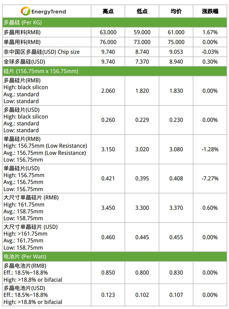 国内156.75mm单晶维持不变在3.02~3.15RMB/Pc,均价为3.08RMB/Pc,大尺寸158.75mm产品维持不变在3.30~3.40RMB/Pc,161.75mm尺寸维持不变在3.45RMB/Pc。多晶修正区间至1.82~1.85RMB/Pc,均价维持不变在1.83RMB/Pc,黑硅产品维持不变在2.06RMB/Pc。
