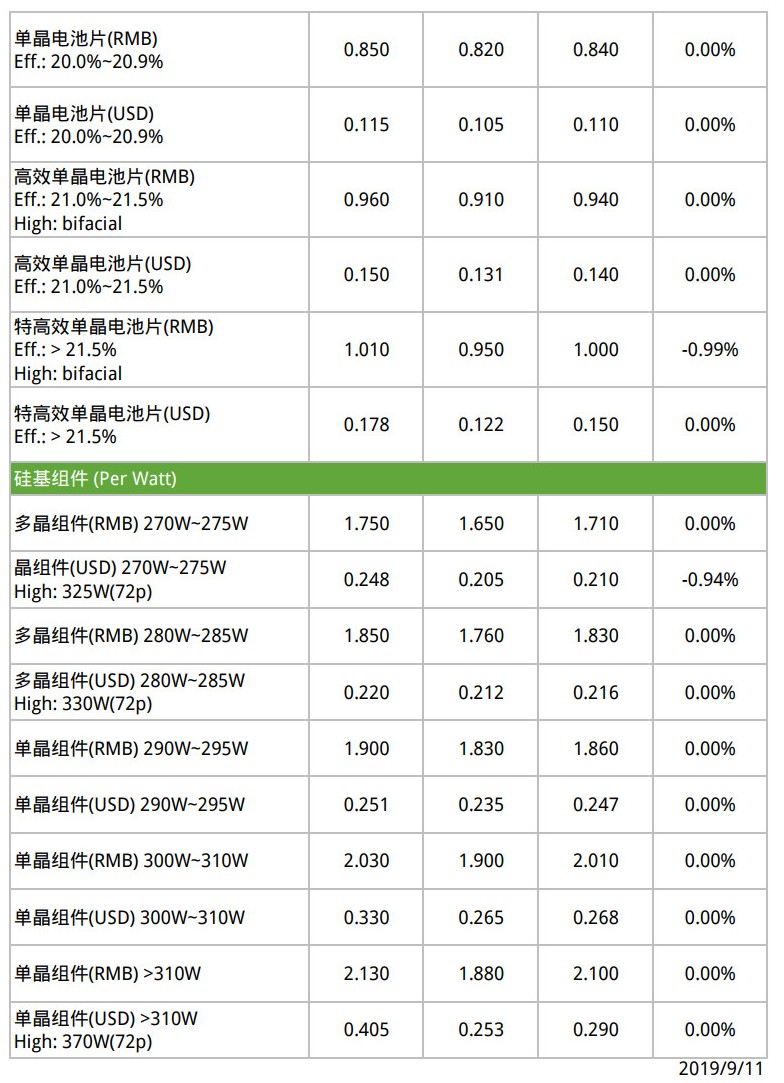 国内270W~275W产品维持不变在1.65~1.75RMB/W,280W~285W产品维持不变在1.76~1.85RMB/W,290W~295W产品维持不变在1.83~1.90RMB/W,300W~305W产品维持不变在1.90~2.03RMB/W,>310W产品维持不变在1.88~2.13RMB/W。