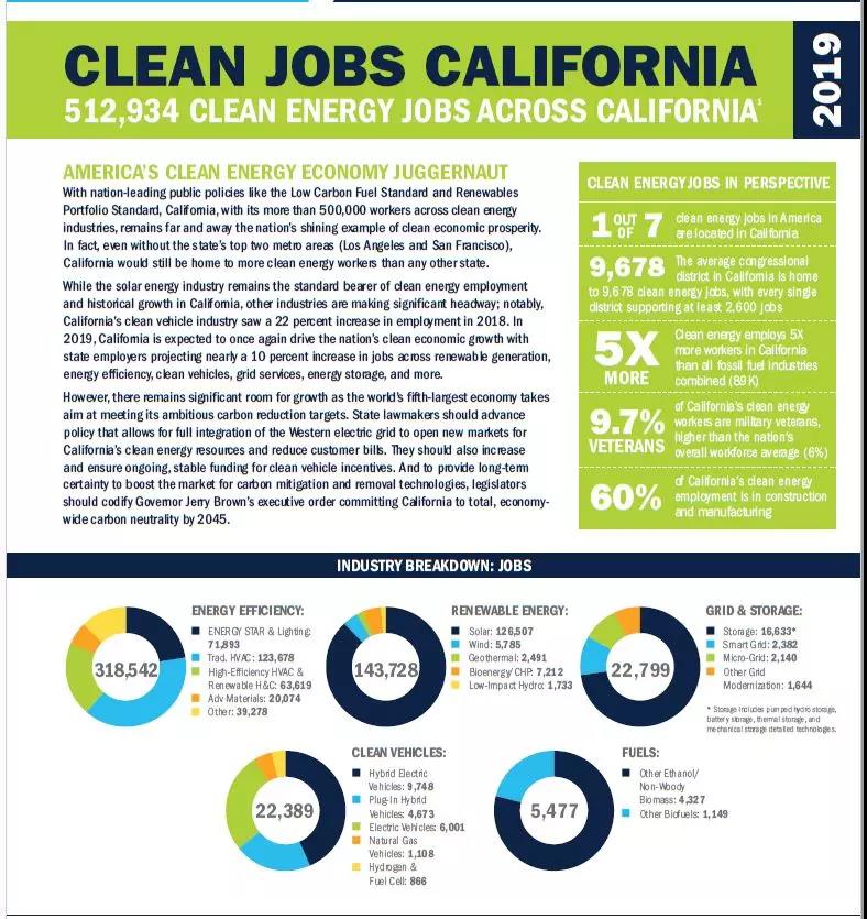 ——在全州范围内,2018年清洁能源行业共有512,934个就业岗位。其中包括可再生能源就业,如安装太阳能和风能;建设电动和混合动力汽车;在建筑物中进行能源效率工作;制造清洁燃料和建设电池存储项目。