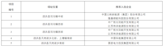 根据泗洪光伏发电领跑奖励激励基地2019年竞争优选工作方案,泗洪县人民政府组织泗洪光伏发电领跑奖励激励基地竞争优选,2019年9月6日开始公示,未收到相关企业异议意见,现将入选企业名单公布如下: