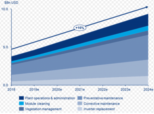 根据Wood Mackenzie的数据,对于50MW太阳能系统,逆变器更换成本仅占平均运维成本的12-13%。不断降低的逆变器成本和制造商利润导致了逆变器更换成本的不断下降。