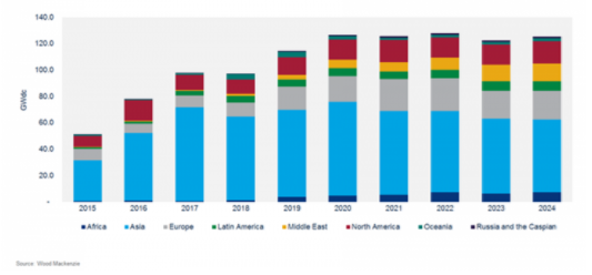 Wood Mackenzie还预测了2019年全球太阳能市场将比2018年增长18%,达到114.5GW的新高,到2024年,全球年新增装机量将突破120GW至125GW。