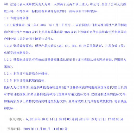 7月10日,晋能控股发布晋北能源(山西)有限公司晋北采煤沉陷区新能源基地光伏逆变器采购招标公告。本招标项目划分为1个标段,包括组串式逆变器4.5GW、集中式逆变器500MW。技术要求如下:注:配套通讯设备、防PID模