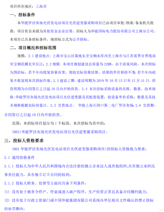 9月1日,华能蒙东公司赤峰基地集中式光伏项目设计管理+PC总承包招标公告发布,招标人为华能内蒙古蒙东新能源有限公司。大唐150MW光伏项目PC总包招标9月2日,大唐建投怀安新能源有限公司15万千瓦光伏项目主体工程PC施工总承包招标公告发布,招标人为大唐建投怀安新能源有限公司。公告显示,该项目位于河北省张家口市怀安县,建设规模为150MW。本次招标不接受联合体投标。
