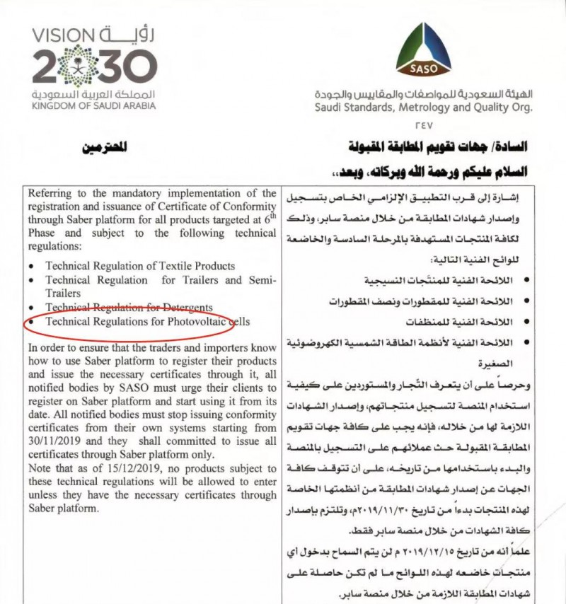 近日沙特阿拉伯标准组织 SASO再次发布公告:纺织产品、拖车和半拖车、洗涤剂和小型光伏系统在出口沙特时,必须使用SABER系统提交申请并取得的产品证书PC (Product Certificate)和批次证书SC (Shipment Certificate),2019年12月1日起执行。