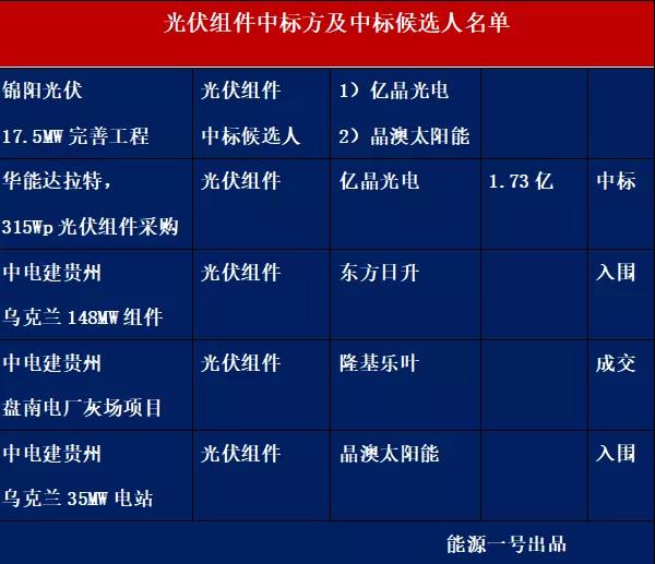 而在上周的锦阳光伏项目移交生产完善性工作17.5MW光伏完善工程的组件采购上,亿晶光电、晶澳太阳能等也分别以3069.6965万元、3176.4537万元获中标候选人资格。这一项目的组件报价最低达1.754元/每瓦。