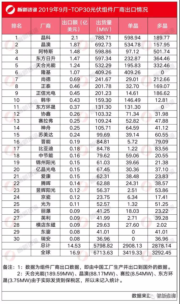 2019年9月,光伏组件总出货量达6.71GW,出口总额16.9亿美元。其中,TOP30厂商出口总量达到5.79GW,出口总额达到了14.53亿美元。其中晶科出口额2.1亿美元,出货量788.71MW,排名第一,晶澳出口额1.87亿美元,出货量692.73MW,位居第二,阿特斯出口额1.48亿美元,出货量598.86MW,排名第三。