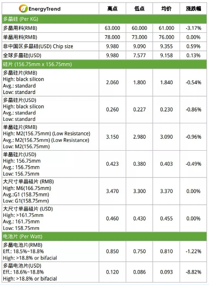 国内156.75mm多晶修正区间至1.80~1.84RMB/Pc,黑硅产品维持不变在2.06RMB/Pc,铸锭单晶产品下修区间至2.67~2.70RMB/Pc。156.75mm单晶修正区间至2.98~3.15RMB/Pc,大尺寸158.75mm产品维持不变在3.30~3.37RMB/Pc,166.75mm尺寸维持不变在3.47RMB/Pc。