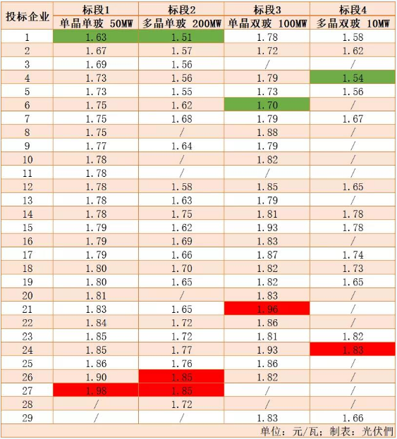 根据招标文件中对投标报价的要求,此次报价为含税、含运费(2000公里以内),其中标段1、2需按TPT背板进行报价,标段3、4需按双面组件(含铝边框)进行报价。但需要注意的是,此次招标并未明确规定组件功率,因此不同投标企业的报价也相差较大。
