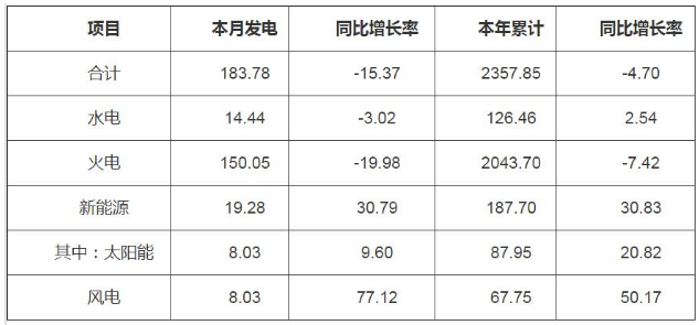(一)发电量情况。10月份当月,全省发电量183.78亿千瓦时,同比减少15.37%。其中水电14.44亿千瓦时,同比减少3.02%;火电150.05亿千瓦时,同比减少19.98%;新能源19.28亿千瓦时,同比增长30.79%。