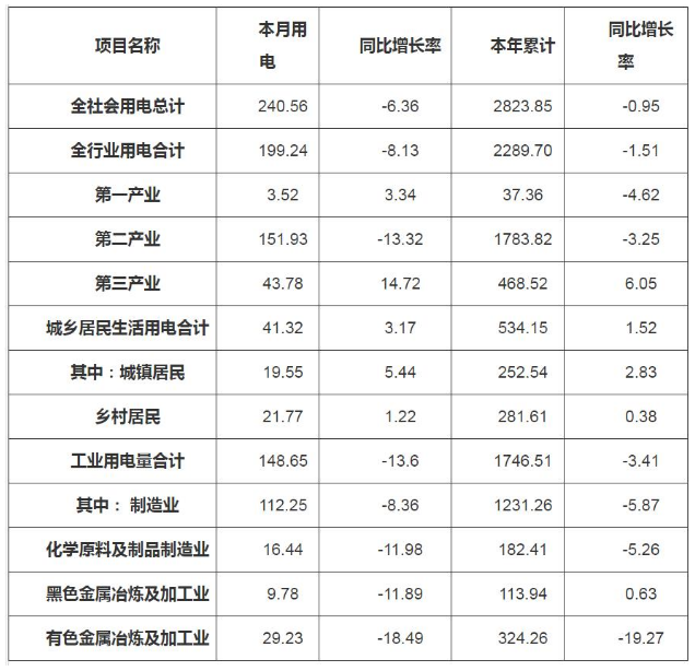 (一)全社会用电量情况。全省全社会用电量240.56亿千瓦时,同比减少6.36%;累计用电量2823.85亿千瓦时,同比减少0.95%。