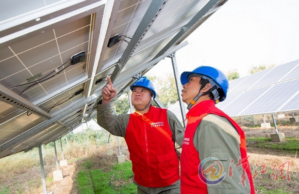为保障全区光伏扶贫电站安全稳定运行,发挥最大扶贫效益,国网襄州区供电公司工作人员主动上门,提供技术指导服务,义务帮助扶贫电站维护发电设备,宣传、讲解光伏设备后期维护及电费结算方式等知识,为其提供“保姆式”服务,以实际行动助力脱贫攻坚。图为11月5日,双沟镇供电所员工在肖坡村分布式光伏扶贫电站检查设备。