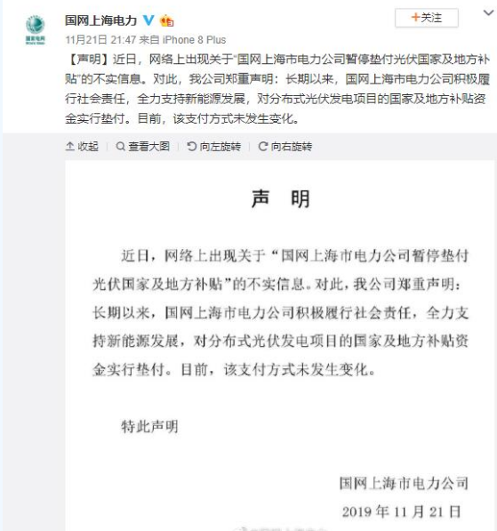 近日,网络上出现关于“国网上海市电力公司暂停垫付光伏国家及地方补贴”的不实信息。对此,国网电力公司郑重声明:长期以来,国网上海市电力公司积极履行社会责任,全力支持新能源发展,对分布式光伏发电项目的国家及地方补贴资金实行垫付。目前,该支付方式未发生变化。