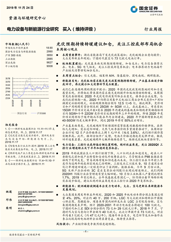我们已在连续两周的周报中提示:2020 年国内光伏政策的落地时间和力度展望乐观,并将由此带来国内需求能见度的提升和板块情绪的转暖。本周国家发改委继续就 2020 年光伏电价政策听取企业意见,据参会企业反馈,与我们此前预期一致,2020 年仍将沿用集中式电站/工商业分布式竞价+户用切换固定补贴的模式,补贴规模预期分别为 12.5 亿+5 亿,据此测算,竞价项目和户用规模有望分别达到 25GW 和 5GW 以上,在此基础上,考虑首批15GW 平价项目完成半数+需在 2020 年内建成的基地类和领跑者奖励指标项目约 5GW+今年 22GW 竞价项目延期到明年上半年的规模,即使 2020 年竞价项目同样给予缓冲期而不能在年内全部建成,2020 年中国新增装机达到40-50GW 仍是大概率事件,同比 2019 年将有 50%左右增长。