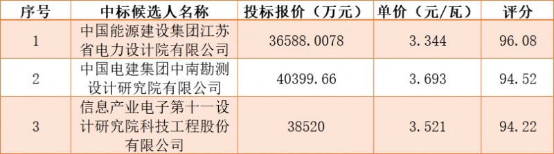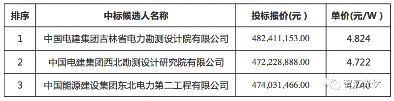 根据公示内容,中国电建集团吉林省电力勘测设计院有限公司以单价4.824元/瓦位列第一中标候选人,详情如下: