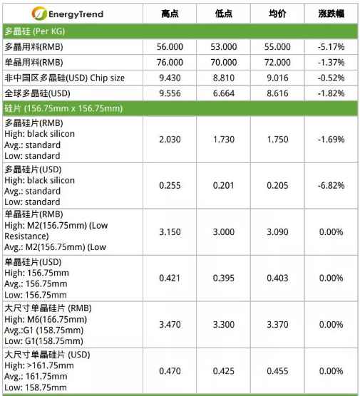 本周硅片价格走势没有过多变化,单晶硅片价格依旧维稳不动,甚至有些急单供应吃紧,多晶硅片的价格持续下探,纵使已经有半数多晶厂家停产也无法阻止价格下探的趋势。目前海外市场多晶硅片修正区间至0.201~0.205USD/Pc,黑硅产品下调至0.255USD/Pc,单晶156.75mm产品修正区间至0.395~0.421USD/Pc,均价维持不变在0.403USD/Pc,大尺寸158.75mm产品修正区间至0.425~0.460USD/Pc,均价维持不变在0.455USD/Pc,161.75mm以上尺寸上调至0.470USD/Pc。
