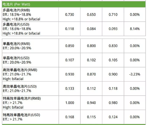 国内一般多晶电池片维持不变在0.65~0.71RMB/W,高效多晶电池片维持不变在0.73RMB/W,一般单晶电池片维持不变在0.80~0.85RMB/W,高效单晶电池片修正区间至0.87~0.93RMB/W,均价下调至0.90RMB/W,特高效单晶(>21.7%)电池片修正区间至0.94~0.98RMB/W。双面特高效单晶(>21.7%)电池片维持不变在1.00RMB/W。