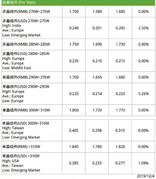 国内270W~275W产品维持不变在1.58~1.70RMB/W,280W~285W产品维持不变在1.69~1.75RMB/W,290W~295W产品维持不变在1.65~1.70RMB/W,300W~310W产品维持不变在1.72~1.80RMB/W,>310W产品维持不变在1.78~1.84RMB/W。