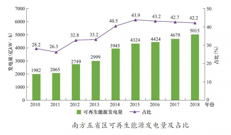 水能、风能、太阳能和生物质能等可再生能源是未来能源发展的主要方向。《中国南方电网可再生能源发展报告》显示,2018年南方五省区可再生能源发电量为5015亿度,占总发电量的42.2%。加上三峡送广东的水电,南方五省区全年实际消纳可再生能源电量为5159亿度,占全社会用电量的44.4%,超出我国和全球平均水平(26.5%和27.0%),也远高于欧盟和美国(32.3%和17.7%),整体消纳比重世界领先。