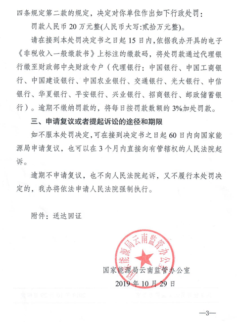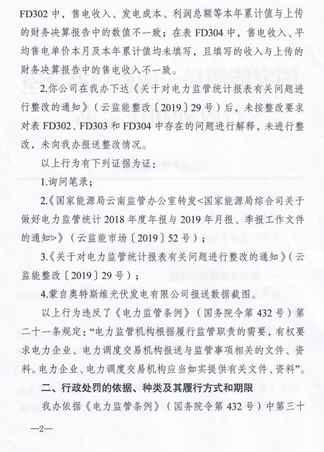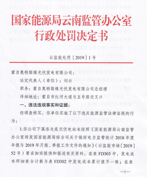 日前,国家能源局云南监管办公室发布了一则行政处罚决定书,文件显示,经河南能监办调查核实,蒙自奥特斯维光伏发电有限公司下属洛戈底光伏电站未按照云南能监办有关文件要求如实提供和报送有关资料,后期未按整改要求对存在的问题进行解释,未进行整改,未向云南能监办报送整改情况,由此被处罚款人民币20万元整。