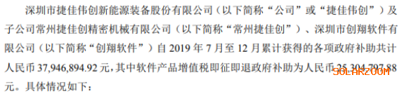 1月12日消息,捷佳伟创(300724)发公告称,深圳市捷佳伟创新能源装备股份有限公司及子公司常州捷佳创精密机械有限公司、深圳市创翔软件有限公司自2019年7月至12月累计获得的各项政府补助共计人民币3794.69万元,其中软件产品增值税即征即退政府补助为人民币2530.48万元。