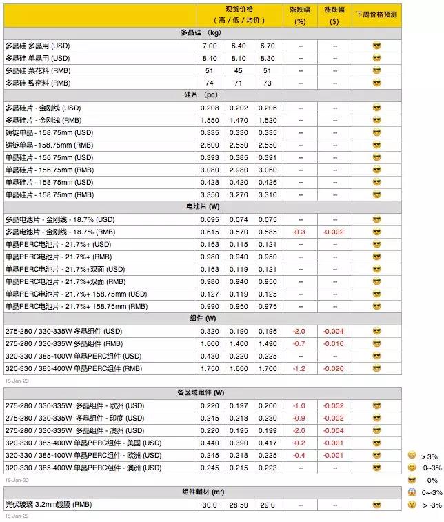 随着印度的保障措施税即将下调,印度的需求已开始出现回温,同时也带动多晶电池片需求略有起色,本周跌幅趋缓,成交价格落在每片2.65-2.7元人民币上下,但由于各家接单情况不一,价格区间拉大,高于、低于主流价格区间的订单也都有出现。随着印度旺季将至,预期农历年后至3月多晶产品需求能较有支撑。国内2019的竞价项目抢装潮延续至今年一季度、加上单晶硅片供应紧张,预期单晶电池片至农历年前价格都能维持平稳,M2尺寸单晶电池片价格维持在每瓦0.95元人民币,G1尺寸大多维持在每瓦0.97-0.98元人民币,但二线厂已出现0.95-0.96元的较低价格。目前观察仍有不少多晶电池片产线在连假期间有较长天数的休假,以控制库存。单晶电池片也有部分电池片厂家在年节小幅休假,但大多厂家仍都维持较高的单晶电池片产线开工率。