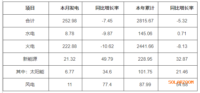 (一)发电量情况。12月份当月,全省发电量252.98亿千瓦时,同比减少7.45%。其中水电8.78亿千瓦时,同比减少9.87%;火电222.88亿千瓦时,同比减少10.62%;新能源21.32亿千瓦时,同比增长49.79%。