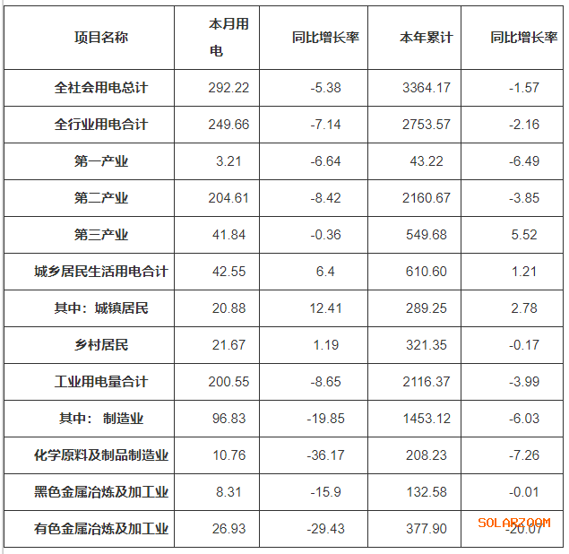 (一)全社会用电量情况。全省全社会用电量292.22亿千瓦时,同比减少5.38%;累计用电量3364.17亿千瓦时,同比减少1.57%。