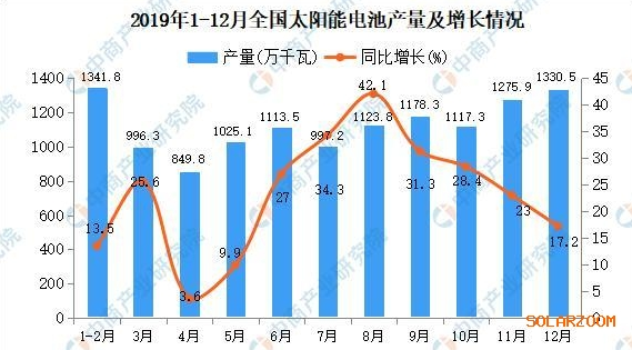 据中商产业研究院数据库显示,2019年1-4季度全国太阳能电池产量呈增长趋势,2019年12月全国太阳能电池产量为1330.5万千瓦,同比增长17.2%。2019年全国太阳能电池产量为12862.1万千瓦,同比增长26.8%。
