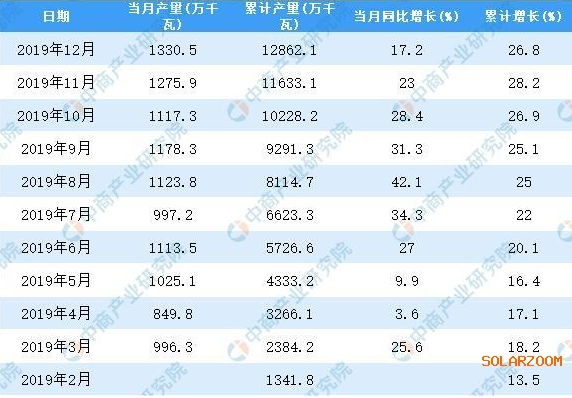 2019年1-12月全国太阳能电池产量统计数据