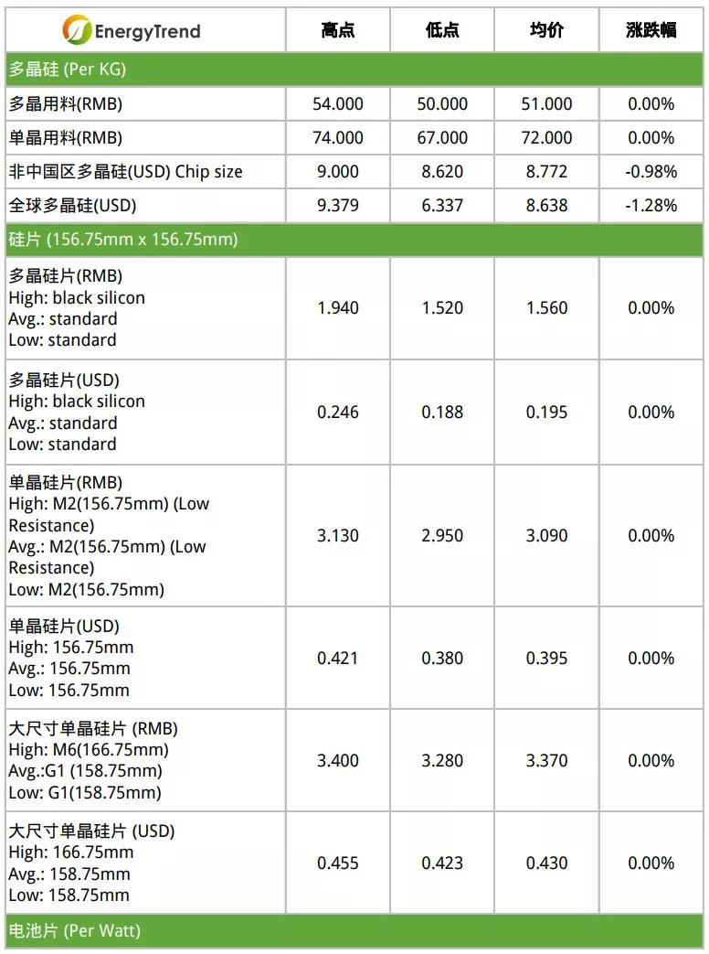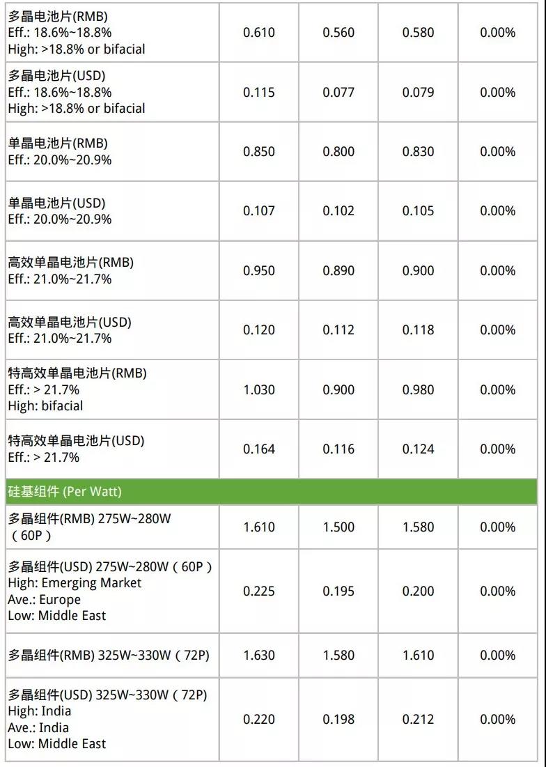 国内一般多晶电池片修正区间至0.56~0.58RMB/W,高效多晶电池片维持不变在0.61RMB/W,一般单晶电池片维持不变在0.80~0.85RMB/W,高效单晶电池片维持不变在0.89~0.95RMB/W,特高效单晶(>21.5%)电池片维持不变在0.90~0.98RMB/W。双面特高效单晶(>21.5%)电池片维持不变在1.03RMB/W。