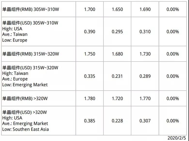 本周组件市场受到疫情影响,国内各省市之间的交通严重受阻,加上开工时间的延期与限制,同时相关辅材欲向海外运输的可能性不高。估计海外组件的价格最先被影响。国内部分则因为整体都在疫情影响范围之内,由上到下都可以相对应地延迟交货或暂缓发货与施工,因而组件出货影响效果不如海外来得明显,整体价格变化会视下周开工后的状况而定。目前海外60片的275W~280W产品维持不变在0.195~0.225USD/W,72片的325W~330W产品维持不变在0.198~0.220USD/W,305W~310W产品维持不变在0.295~0.390USD/W,315W~320W产品维持不变在0.231~0.335USD/W,>320W产品维持不变在0.228~0.385USD/W。国内60片的275W~280W产品维持不变在1.51~1.62RMB/W,72片的325W~330W产品维持不变在1.59~1.63RMB/W,305W~310W产品维持不变在1.63~1.69RMB/W,315W~320W产品维持不变在1.71~1.80RMB/W,>320W产品维持不变在1.76~1.81RMB/W。
