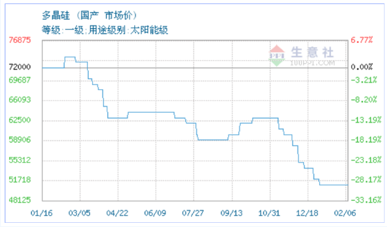 2月06日国产关于多晶硅的报价为51000元/吨。多晶硅的规格:等级:一级;用途级别:太阳能级。该报价有效期为3天。报价提供方:国内市场。