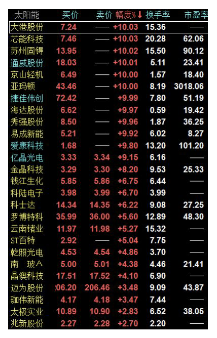 同样延续昨日光伏强势,在今天沪市大盘跌20.83点的大环境下,光伏版块表现强劲,成为今天大盘最好的逆行者!捷佳伟创、易成新能、海达、金晶科技、科陆电子、罗博特科、晶澳、迈为、太极实业均表现优异。