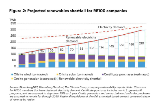 根据最新文件,RE100截至2019年共有221名成员,BNEF估计,到2030年,这221家RE100公司将需要额外购买210 TWh清洁电力,以实现其目标。如果通过异地PPA弥补这一短缺,则将在全球催化约105GW的新太阳能和风能建设。为这些新增加的项目提供资金预计将需要增加980亿美元的投资。