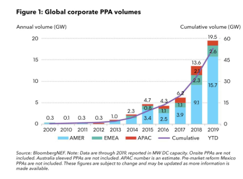 2019年,企业通过购电协议(PPA)购买了创纪录的清洁能源,比上一年的记录增长了40%以上。其中,大部分采购发生在美国,但强劲的上升趋势支撑着全球范围内对企业可持续发展的承诺激增。