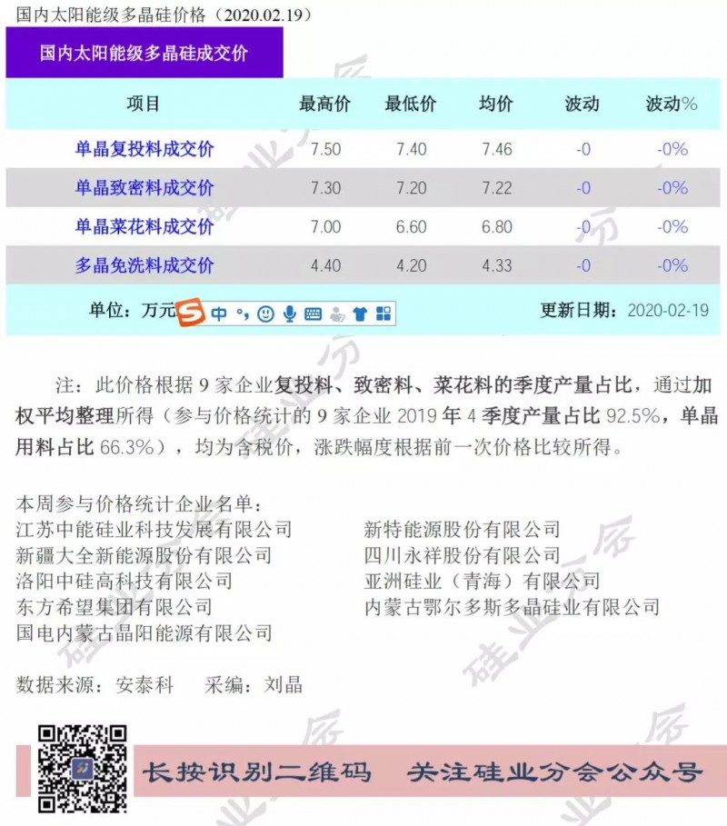 本周多晶硅价格整体持稳,包括复投料、单晶致密料、单晶菜花料、多晶免洗料成交均价都持稳不变。主要原因有以下几方面:第一,下游企业中,虽一线大厂基本维持满负荷运行,但部分二三线企业受疫情影响开工率略显不足,故多晶硅料需求增幅受限;第二,多晶硅企业中,虽有一线大厂受原料不足影响降低开工率,但2019年底行业库存尚有部分未消化,故目前供应仍相对充足;第三,多晶硅当月主流订单一般于上月底就已签订完毕,2月份主流订单同样已基本签订完毕,本周只有部分新签补单,在市场供需无大幅波动而前期主流价格已定的情况下,补单价格也大多随主流订单而定,以持稳为主。