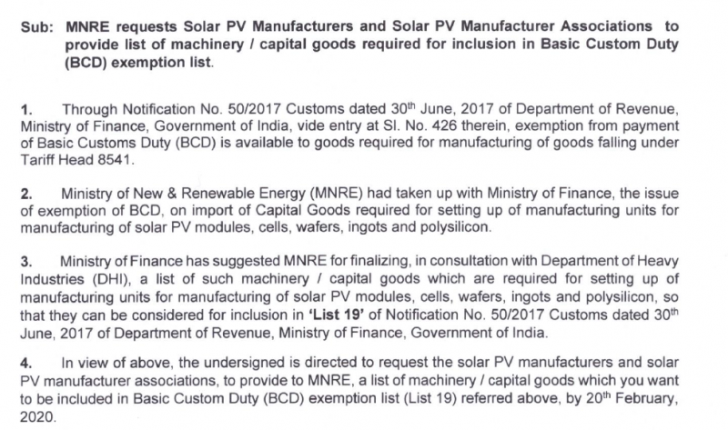 近日,印度MNRE发布通知,要求光伏制造商和协会提交希望列入基本海关关税(BCD)豁免清单的机械和资本货物清单,包含多晶硅料、铸锭和硅片、光伏电池、组件等环节。
