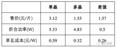 从上表可以看出,由于单晶硅片和多晶硅片的价差较大,在组件端形成0.26元/W的价差。