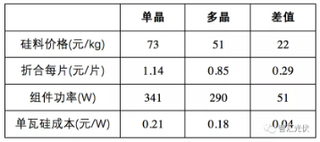 硅片成本中,分为硅成本和非硅成本。1、硅成本硅成本则主要由多晶硅料的价格来决定的。如果按照156.75mm硅片考虑,目前1kg单、多晶硅片的出片量约为64片和60片,封装成320W和290W组件,则折合的硅成本如下。