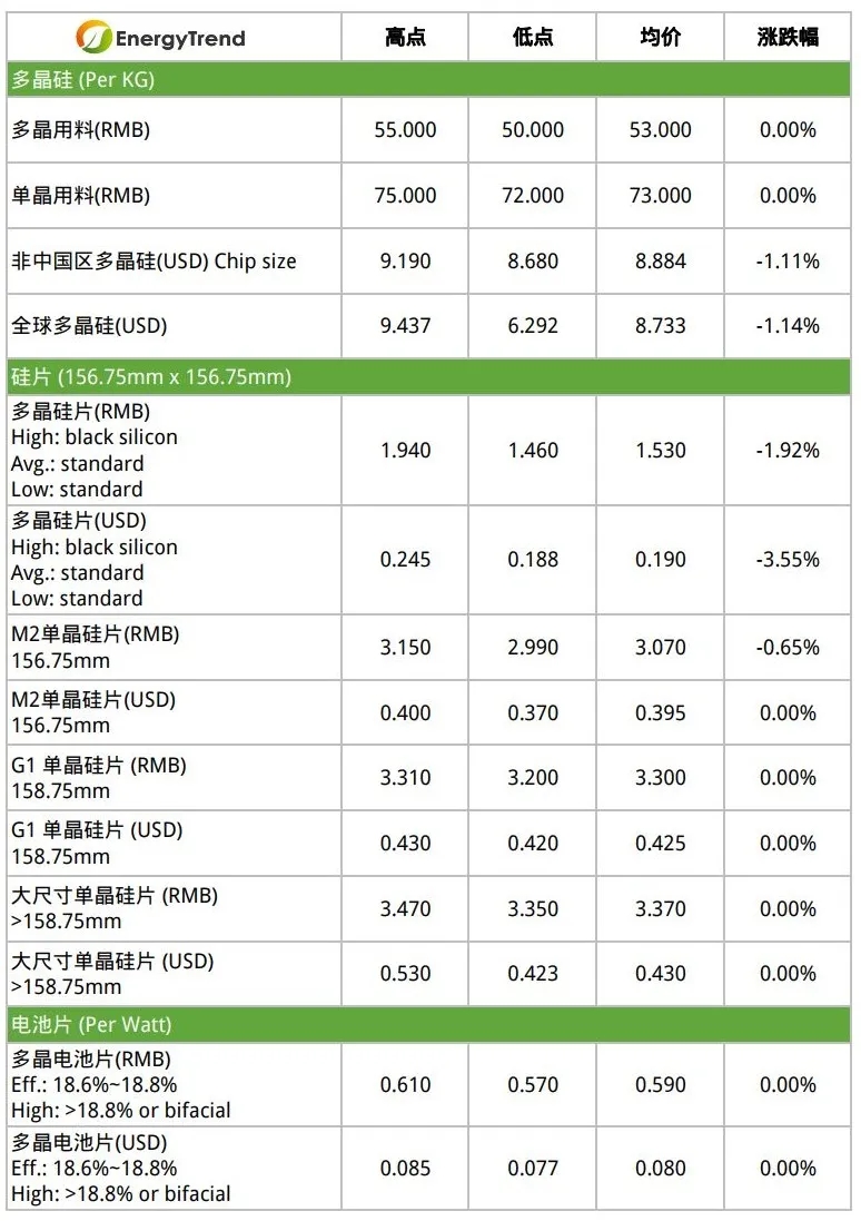 目前国内单晶用料维持不变在72~75RMB/KG,多晶用料维持不变在50~55RMB/KG。海外价格下调至8.68~9.19USD/KG,均价下调至8.88USD/KG,全球均价下调至8.73USD/KG。