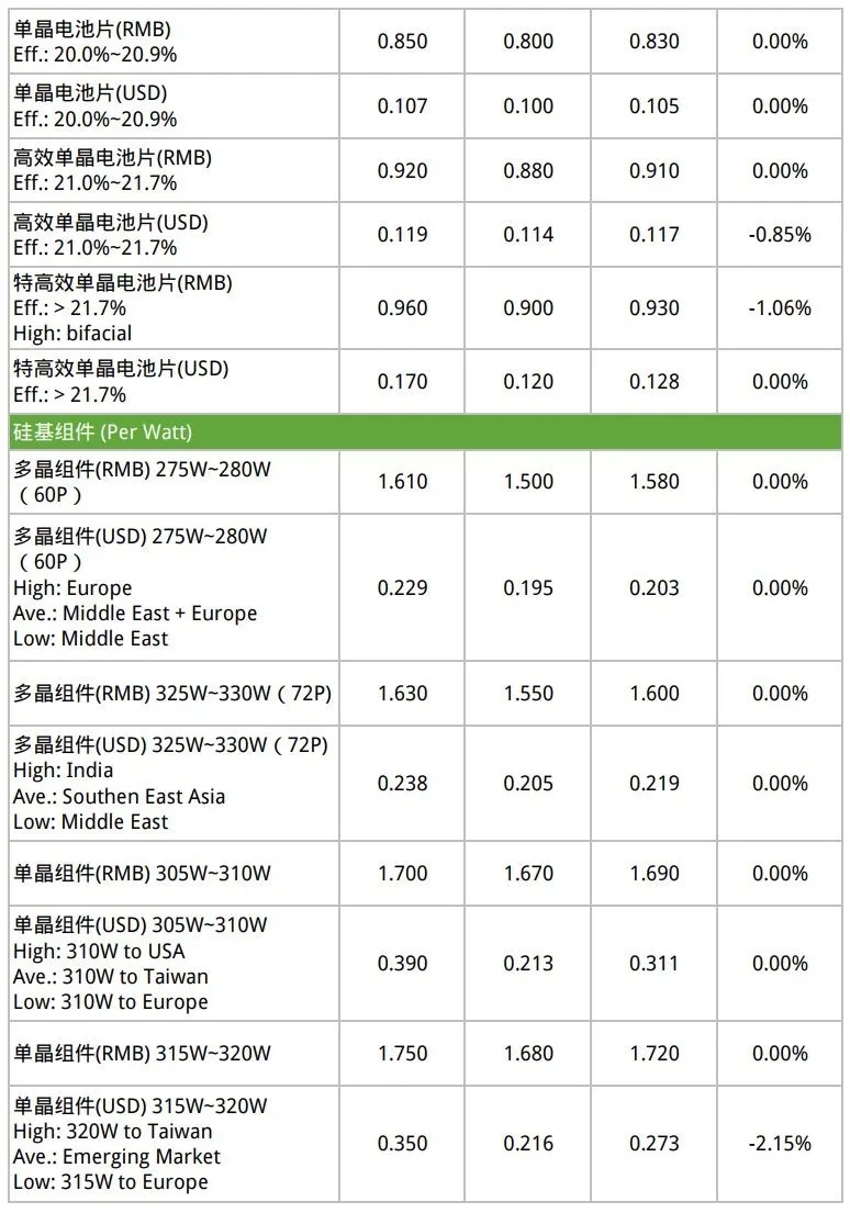 国内60片的275W~280W产品维持不变在1.50~1.61RMB/W,72片的325W~330W产品维持不变在1.55~1.63RMB/W,305W~310W产品维持不变在1.67~1.70RMB/W,315W~320W产品维持不变在1.68~1.75RMB/W,>320W产品维持不变在1.73~1.78RMB/W。