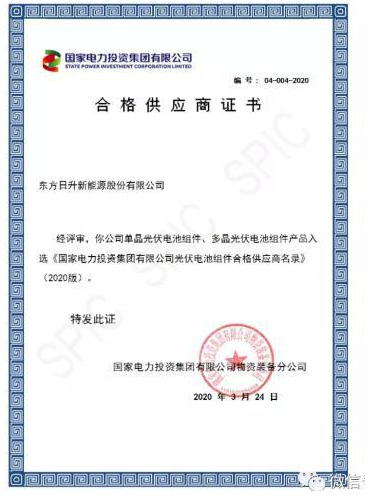近日,国家电力投资集团有限公司(简称“国家电投”)公布合格供应商名单,东方日升(300118)凭借优异的产品性能、出色的生产能力及良好的业内口碑等综合实力脱颖而出,成为单晶光伏电池组件、多晶光伏电池组件两个产品单元的合格供应商。