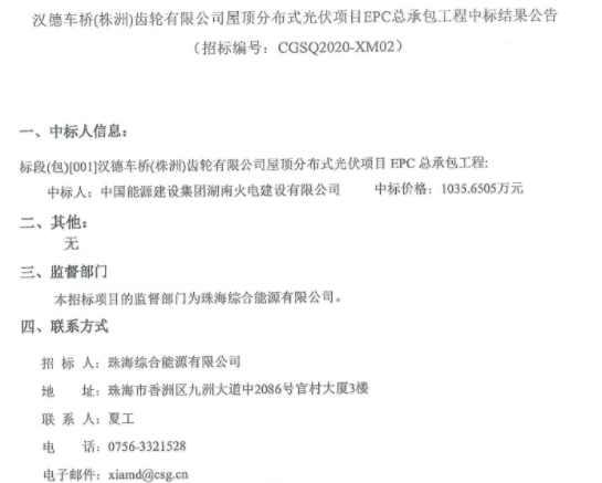 4月15日,汉德车桥(株洲)齿轮有限公司屋顶分布式光伏项目EPC总承包工程中标结果公示,据公告显示,中国能源建设集团湖南火电建设有限公司以2.0713元/W,共计1035.6505万元中标。