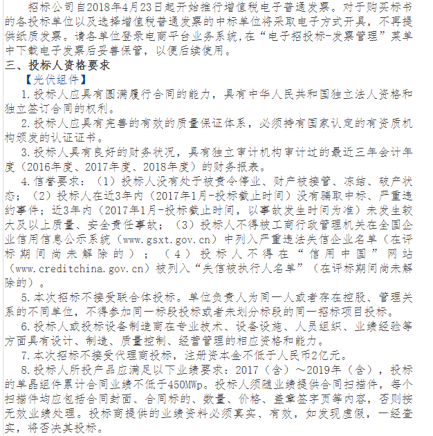 11月24日,甘肃腾格里沙漠河西新能源基地80万千瓦高效光伏组件采购招标公告,招标人为华电甘肃能源有限公司,招标容量为800MW,最大功率不小于650W,光电转换效率要求正面≥23.8%,背面峰值功率不低于正面的70%。要求合同生效后15日内开始供货,原则上2026年6月前完成全部组件供货。