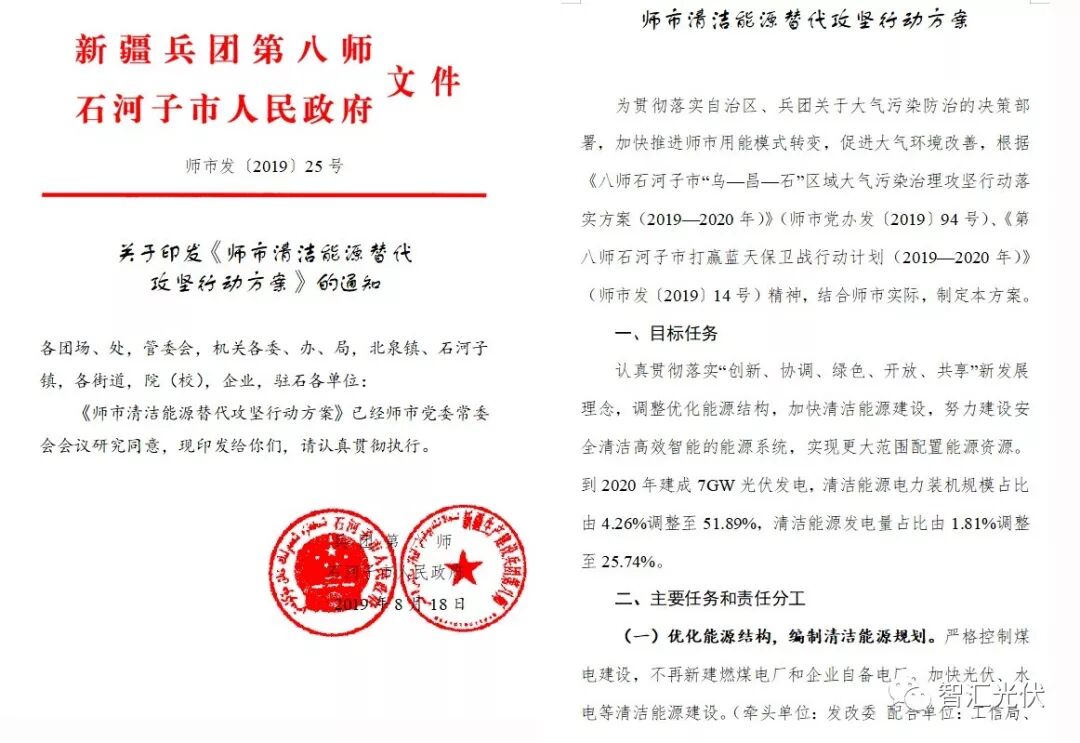 2019年8月,新疆石河子市出台清洁能源替代攻坚行动方案。提出:到2020年底建成7GW光伏发电,清洁能源电力装机规模占比由4.26%调整至51.89%,清洁能源发电量占比由1.81%调整至25.74%;并明确了送出方案。(详见:新疆石河子:清洁能源装机提高12倍,2020年新增光伏7GW)