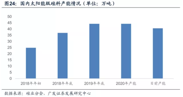 硅料环节落后产能退出,市场份额逐渐向龙头企业集中。硅料占整个系统的成本进一步下降,对价格上行的容忍度增加。从上文可以看到,单晶致密料的价格环比继续下行,进一步压缩成本较高硅料企业的生存空间。另外,硅料在终端系统中的成本进一步降低,当硅料价格在60元/公斤(税后),158.75mm硅片每公斤硅料出片率为65片,输出功率5.6W/片的情况下,硅料的成本为0.16元/W,占组件的成本为约为13%,占整个系统的成本不足7%,整个系统对硅料价格波动的容忍度会有所增加。